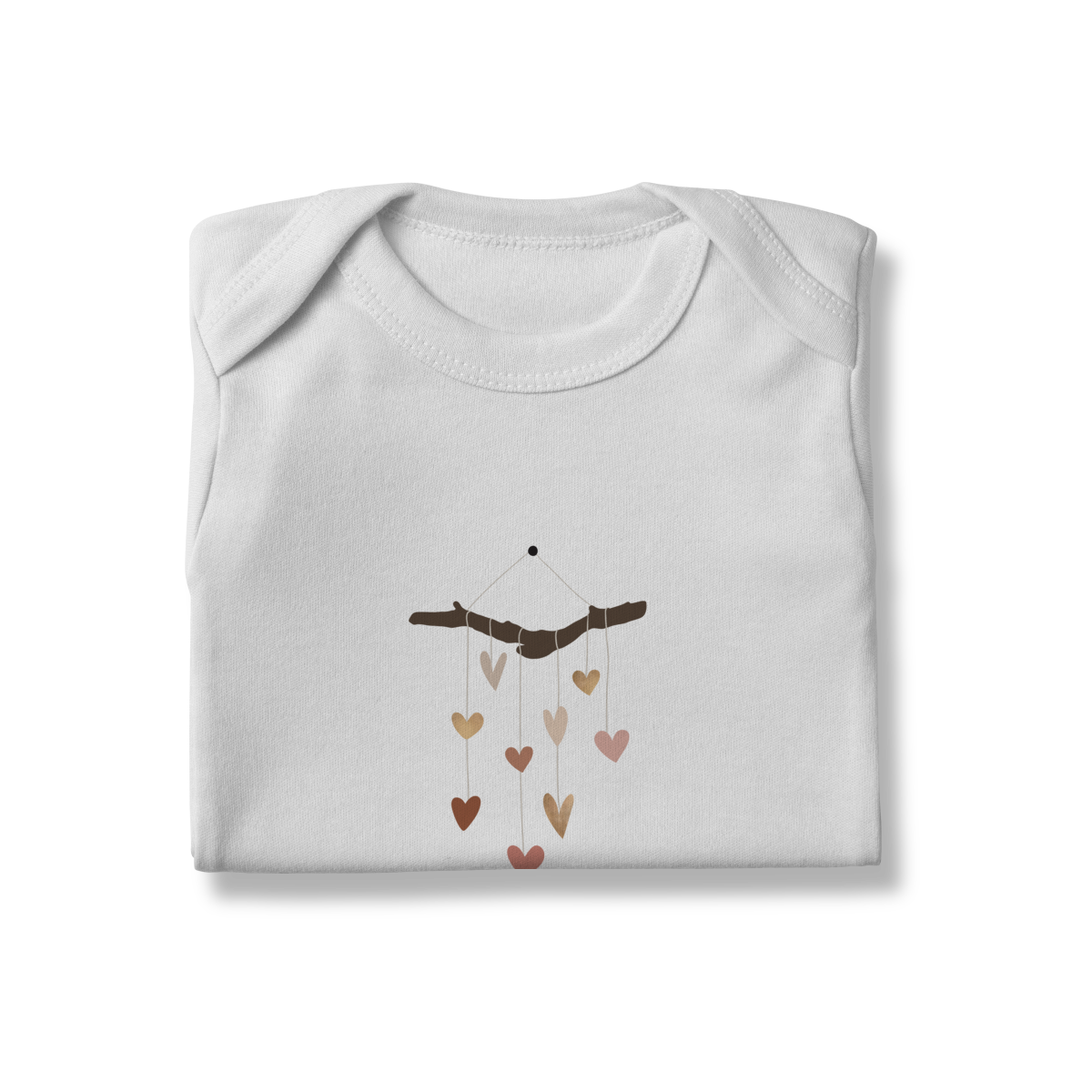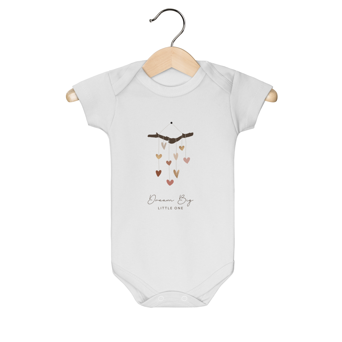 Body infantil fofo com estampa minimalista “Dream Big Little One”, perfeito para bebês que inspiram amor e ternura. A arte traz um móbile de corações em tons suaves, ideal para compor looks delicados, presentes de maternidade, chá de bebê e ensaios newborn. Confortável, estiloso e cheio de significado para o seu pequeno sonhador.