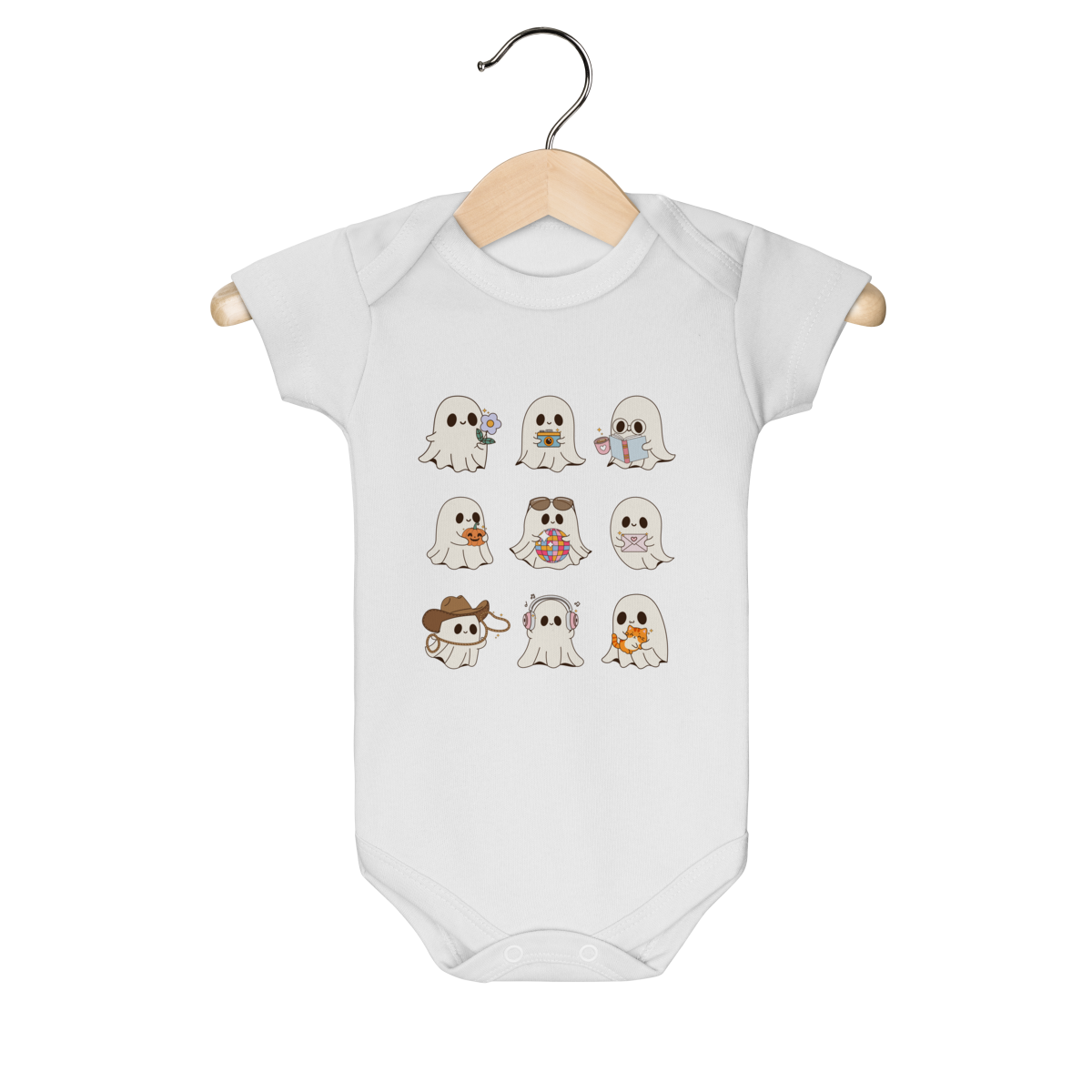 Body infantil branco com estampa divertida de nove fantasminhas fofos. Cada fantasma traz um detalhe especial (flores, óculos, fones, fantasias criativas), deixando a peça única e cheia de personalidade. Produzido em tecido macio e confortável, é ideal para o dia a dia, festas temáticas, Halloween ou ensaios fotográficos. Um presente criativo e cheio de estilo para bebês.