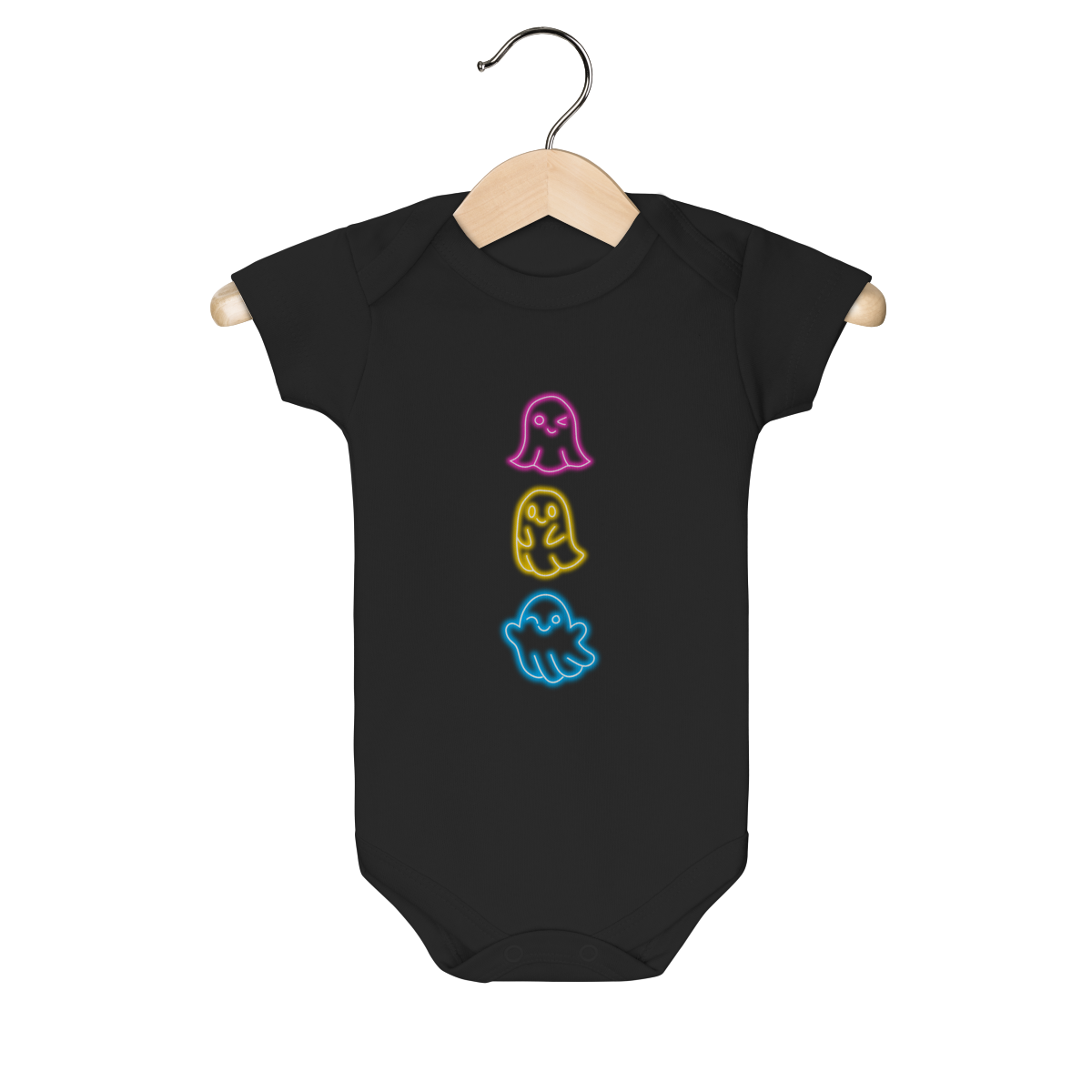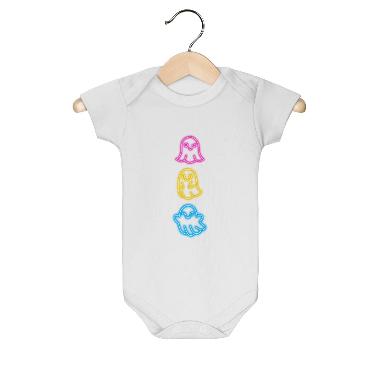Body infantil com estampa divertida de fantasminhas coloridos em estilo neon (rosa, amarelo e azul).