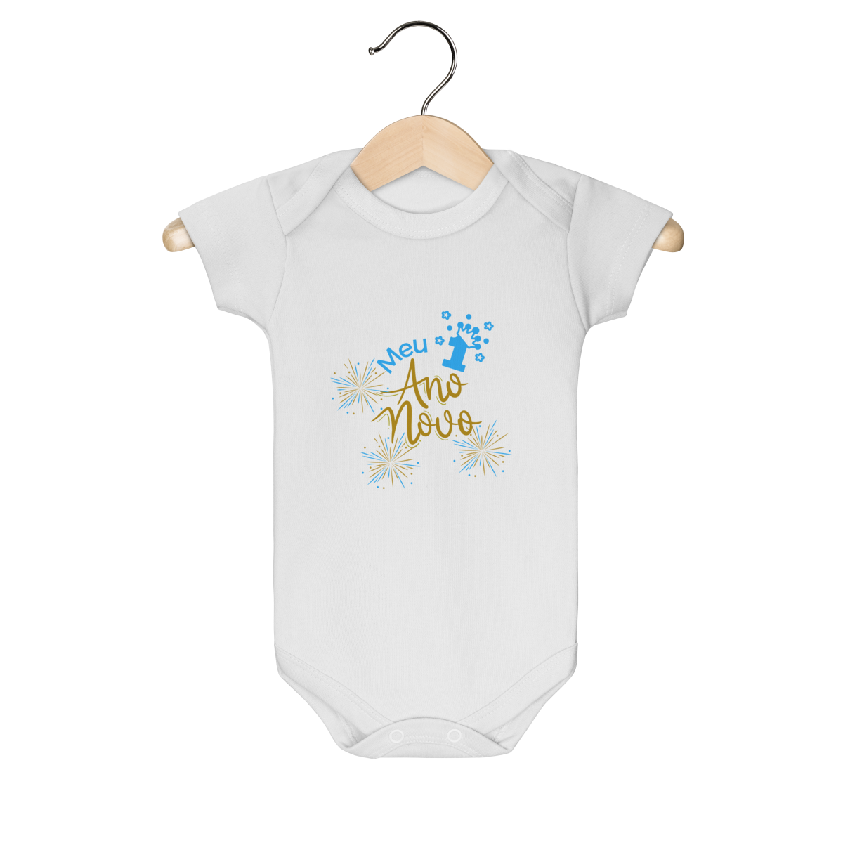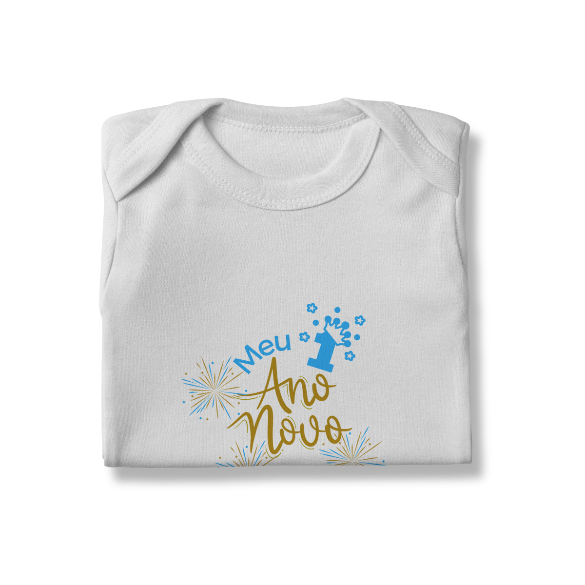 Este body traz a frase “Meu 1º Ano Novo” em tipografia dourada e azul, acompanhada de fogos de artifício ilustrados que deixam a peça ainda mais festiva e encantadora.