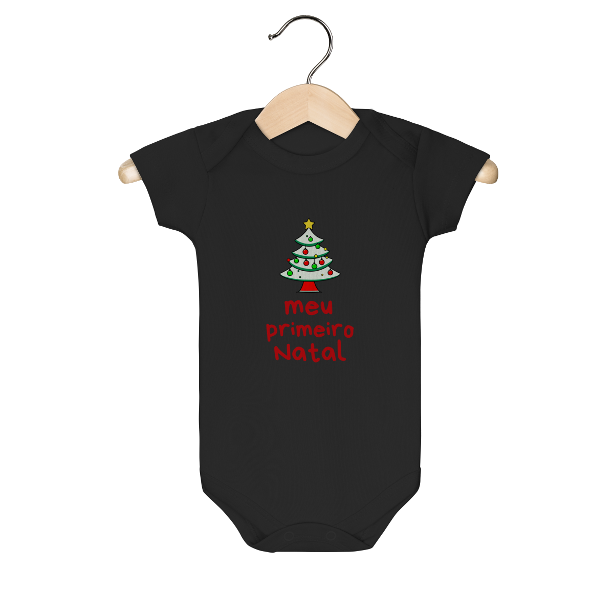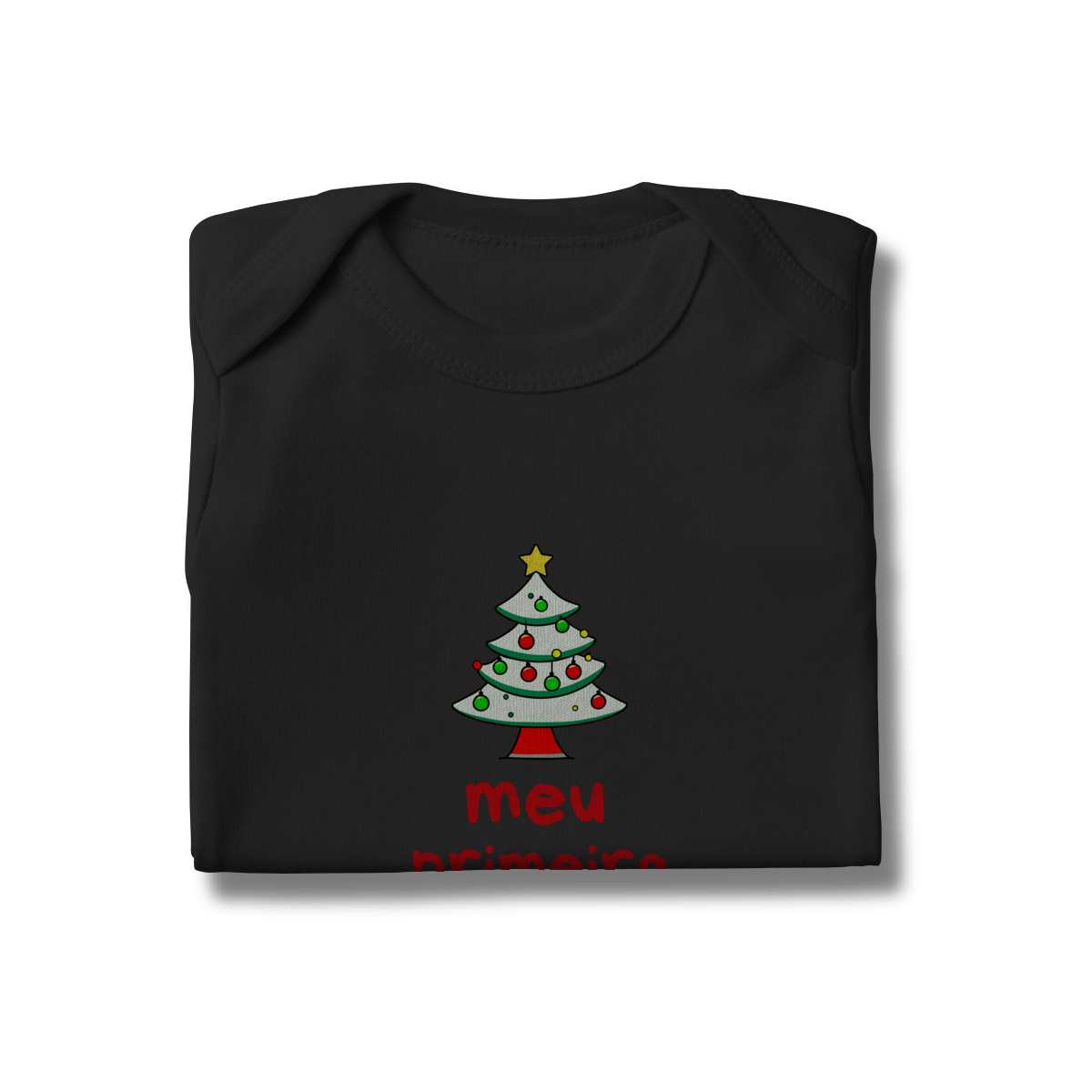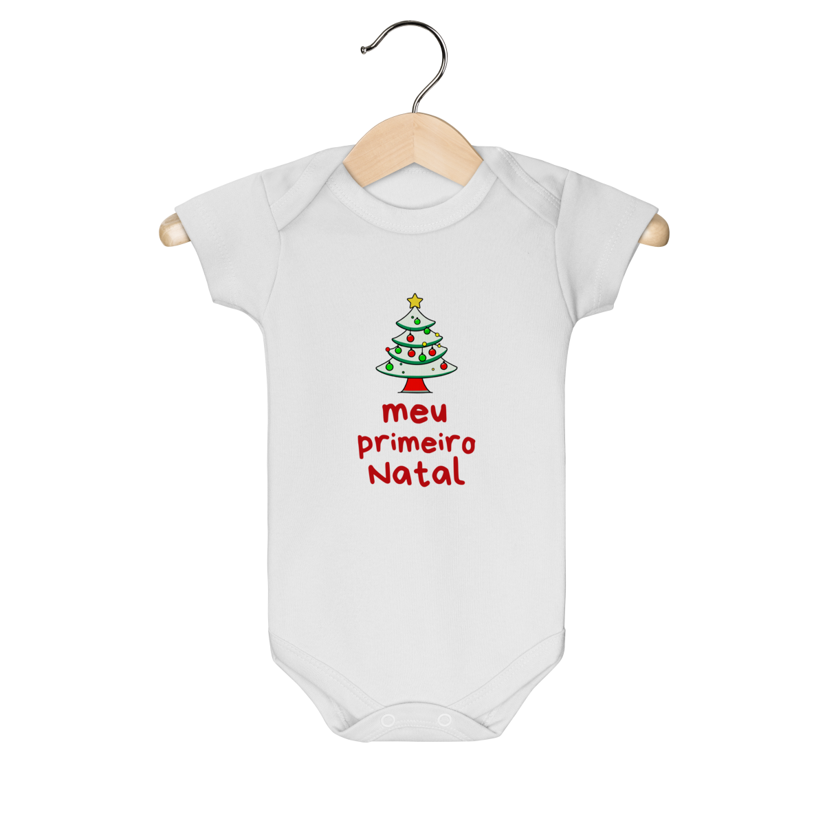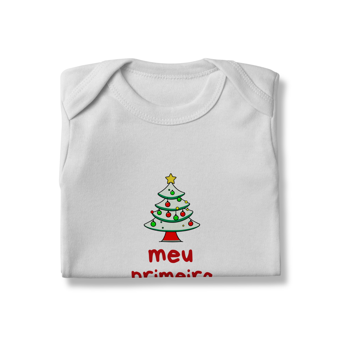 Com uma ilustração delicada de árvore de Natal e a frase “meu primeiro Natal” em vermelho vibrante, ele é ideal para celebrar essa data tão especial com o bebê — seja para fotos, encontros em família ou como lembrança afetiva.