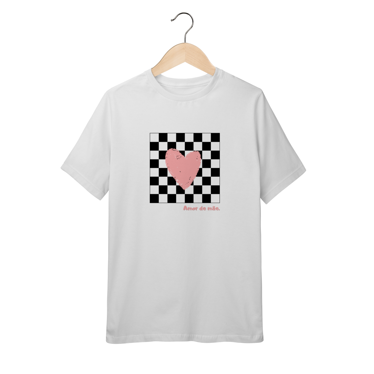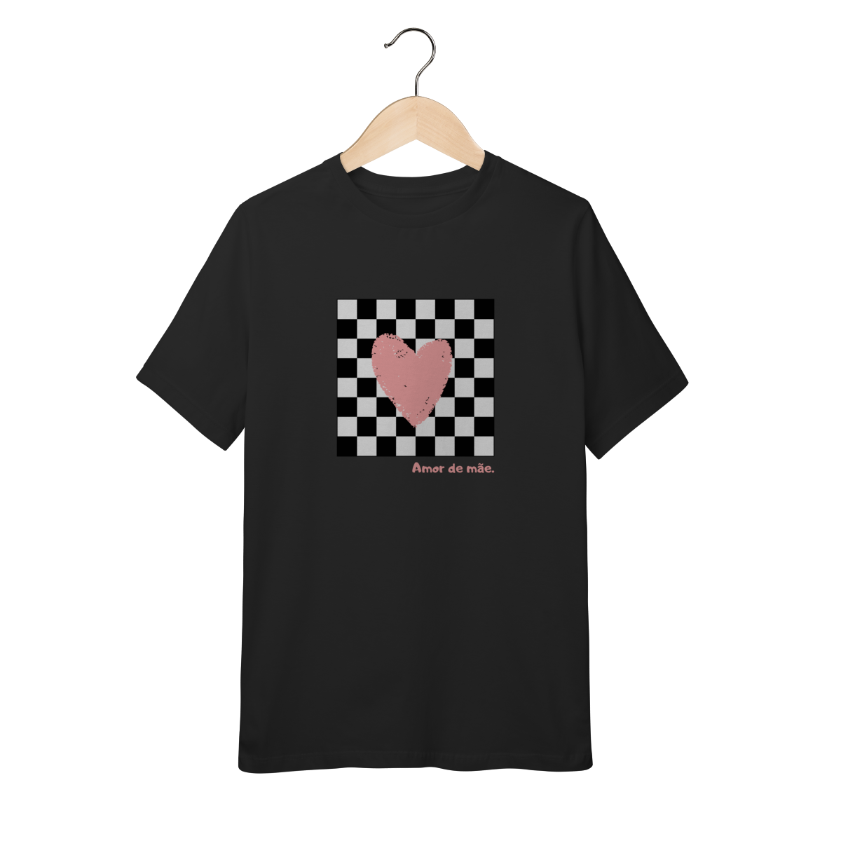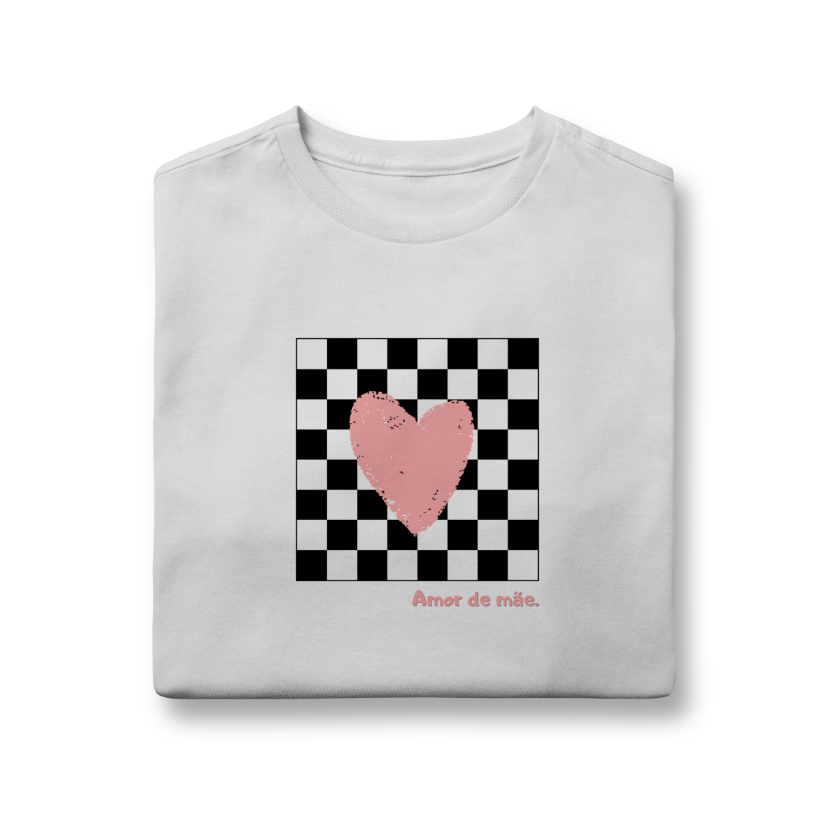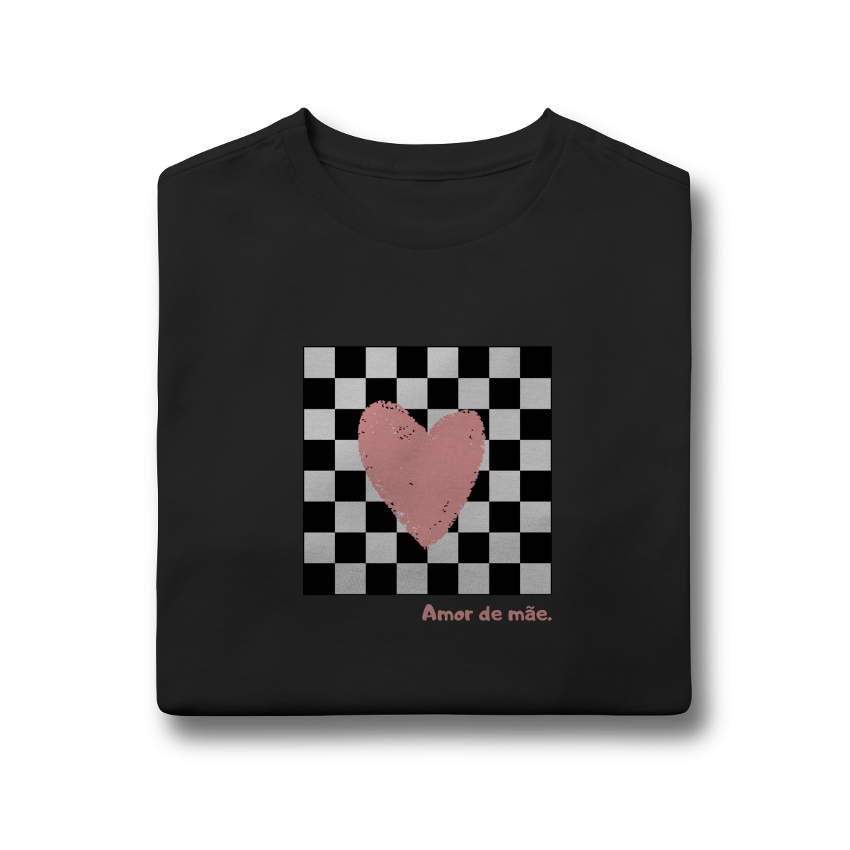Com estampa de um coração rosa sobre um fundo xadrez preto e branco, ela traz um visual moderno e estiloso, mas com uma mensagem super afetiva: “Amor de mãe.”