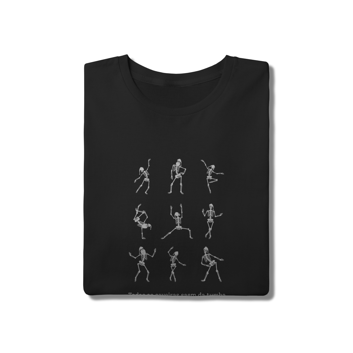 Camiseta preta divertida com estampa de caveiras dançantes e a frase “Todas as caveiras saem da tumba”. Feita em tecido leve e confortável, é perfeita para quem ama Halloween, estilo alternativo e looks criativos. Ideal para festas temáticas, dia a dia descontraído ou como presente diferente e original.