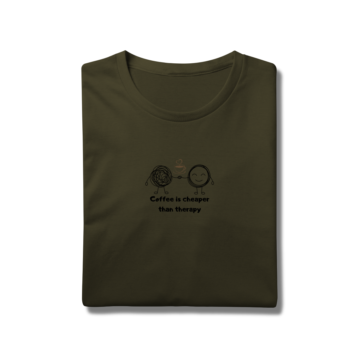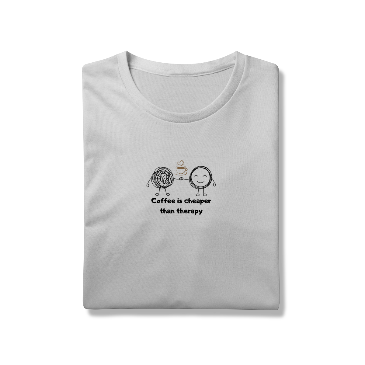 Uma camiseta perfeita para quem acredita que um bom café resolve quase tudo. A estampa “Coffee is cheaper than therapy” traz um toque divertido com desenho minimalista que representa o antes e depois de tomar café — ideal para quem ama humor, café e lifestyle confortável. Ótima para presentear amigos, baristas, amantes de café ou para usar no dia a dia com muito estilo.