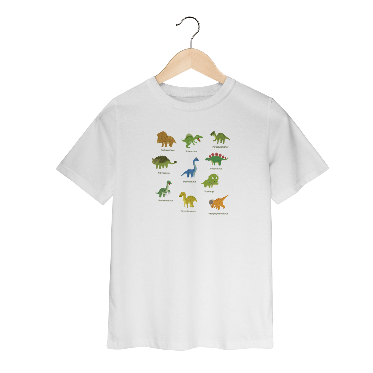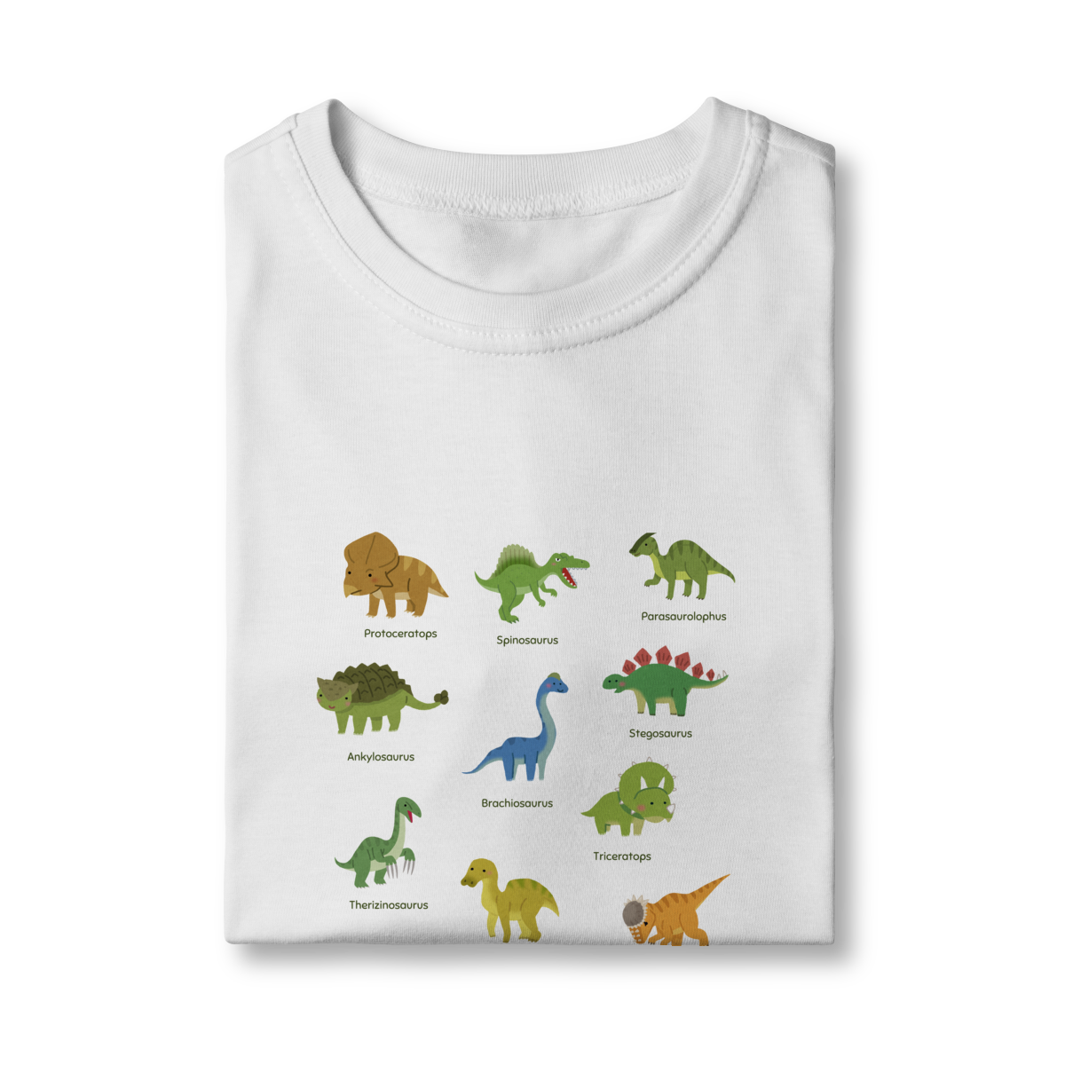 Camiseta infantil super divertida com estampa de dinossauros, perfeita para pequenos exploradores! A peça traz ilustrações coloridas e os nomes dos dinos — ideal para estimular a curiosidade, o aprendizado e o amor pelo mundo pré-histórico. Macia, confortável e perfeita para usar na escola, passeios ou como presente criativo para crianças que amam dinossauros.