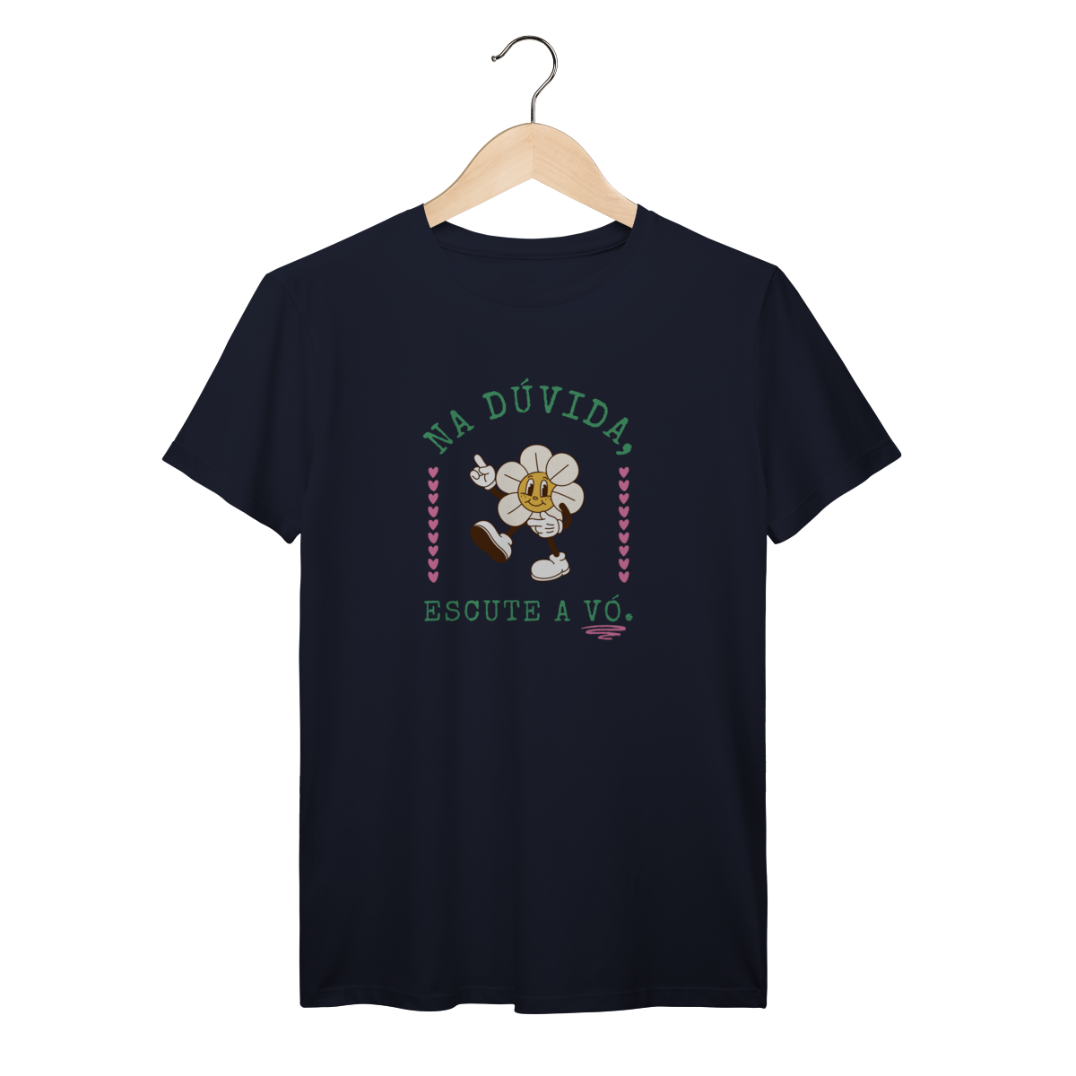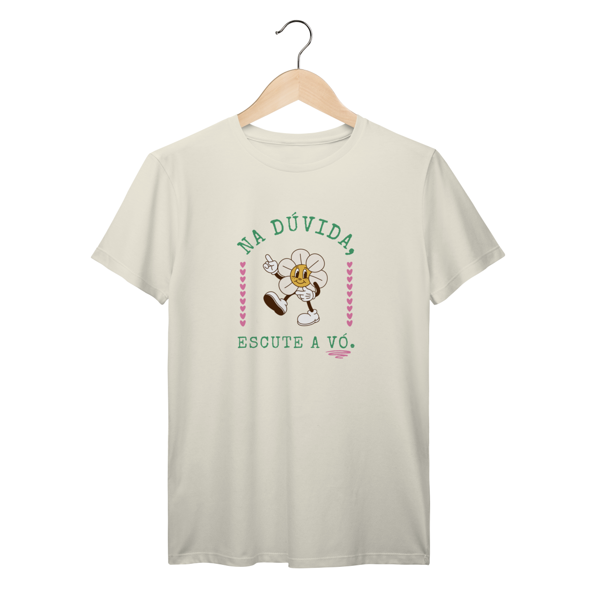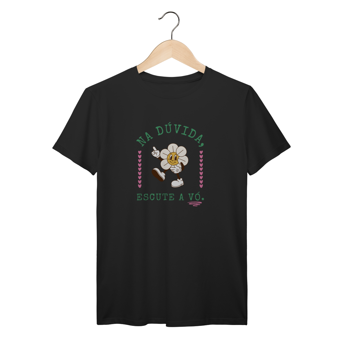 Camiseta divertida e cheia de carinho com a frase “Na dúvida, escute a vó” acompanhada de uma ilustração fofa de flor sorridente.
