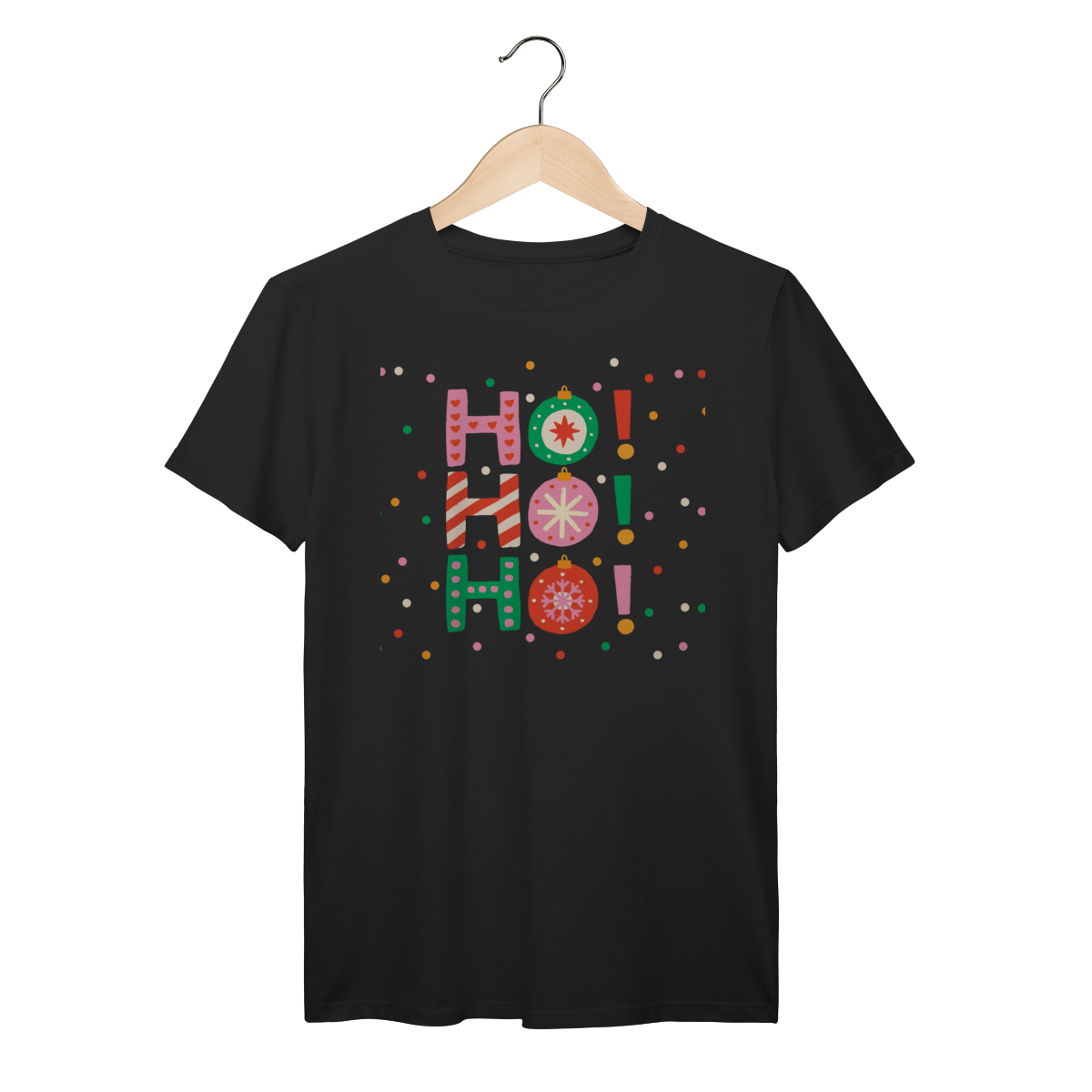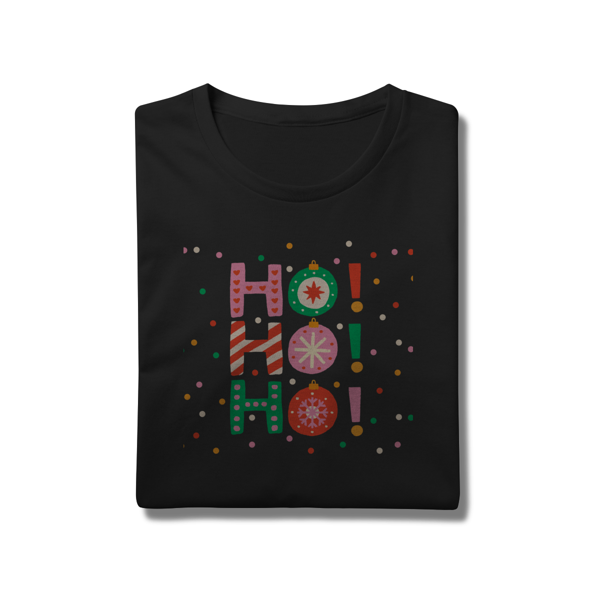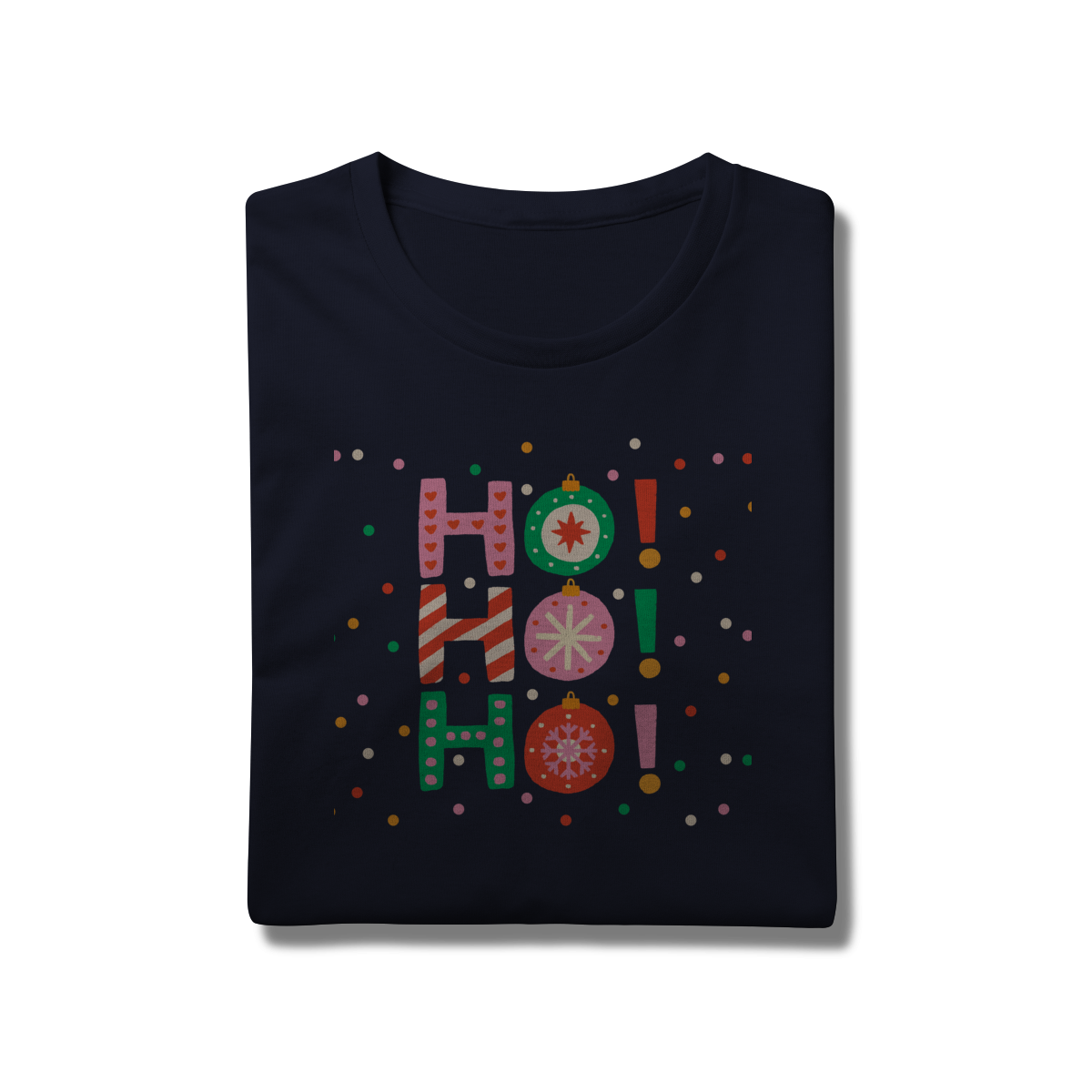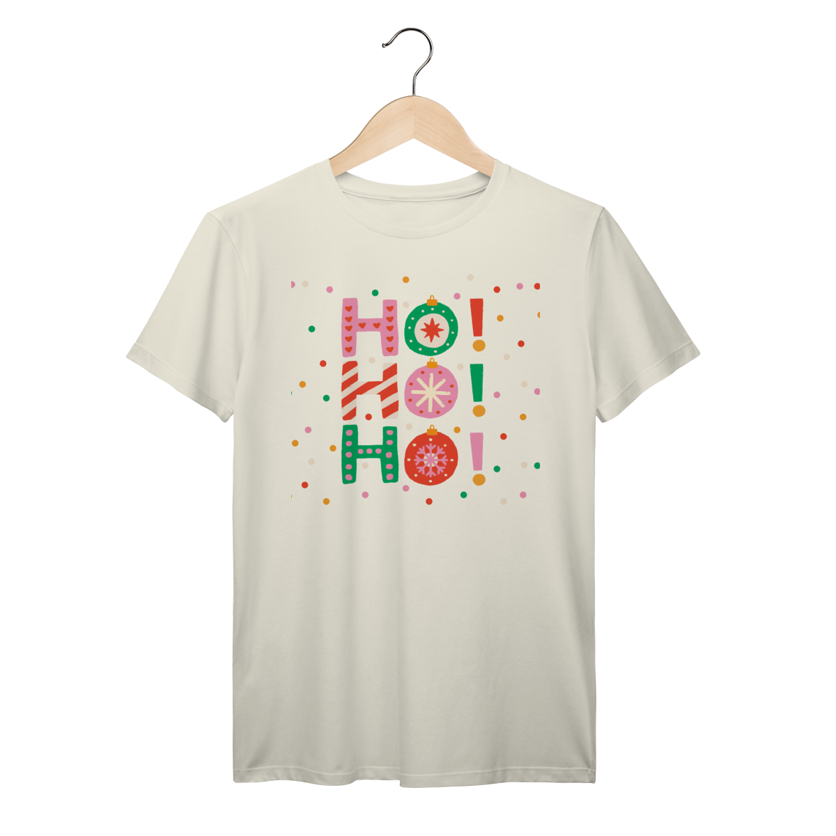Com a estampa “Ho Ho Ho!” estilizada em letras super coloridas — com detalhes em candy cane, bolas e estrelas — e rodeada por confetes festivos, ela traz aquele mood de festa que combina com dezembro inteiro.