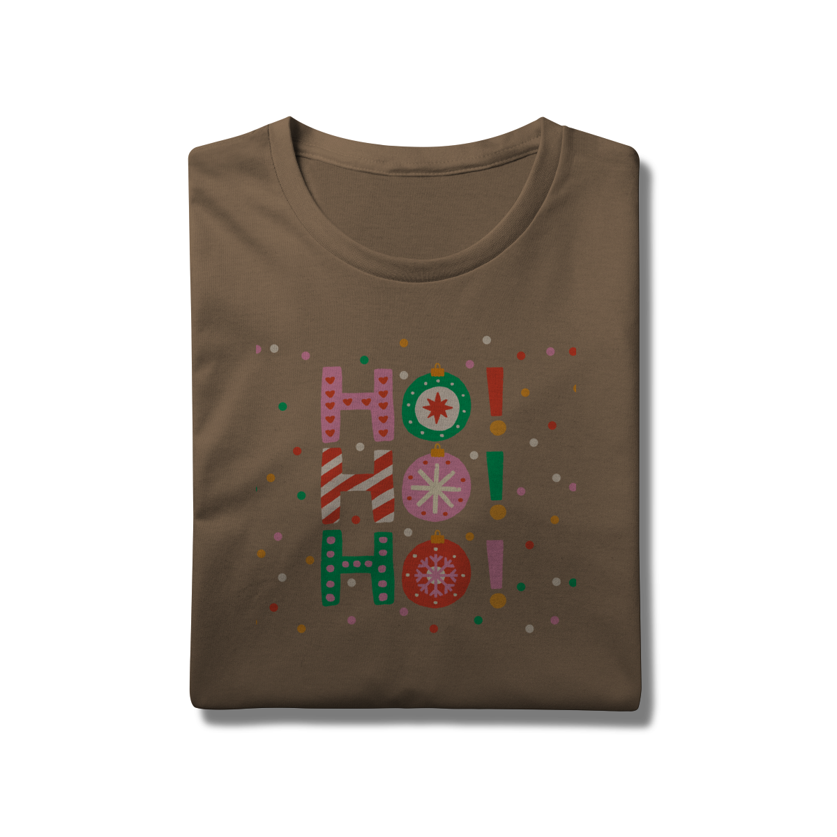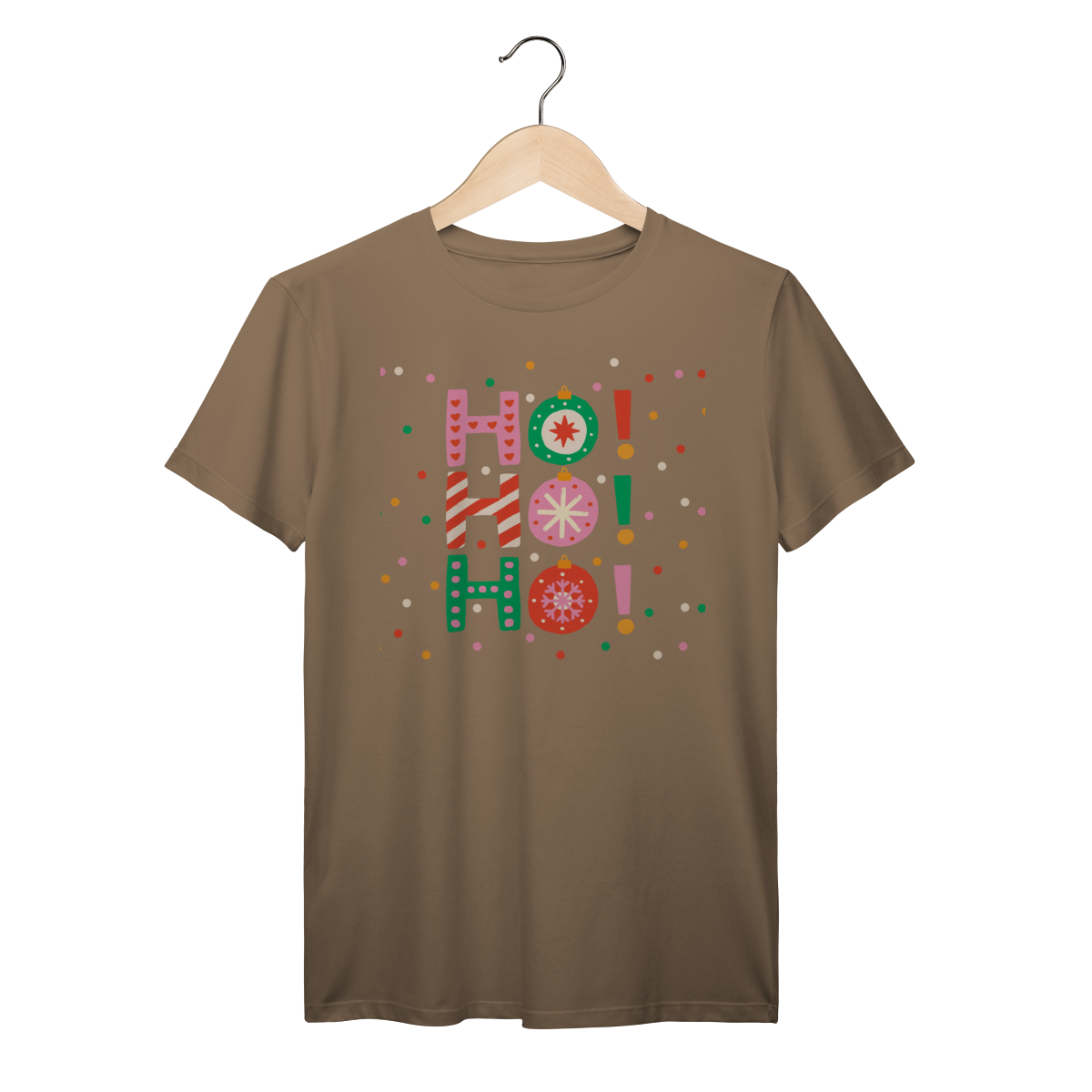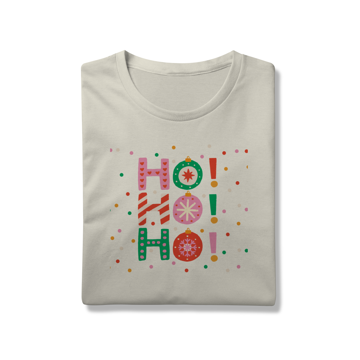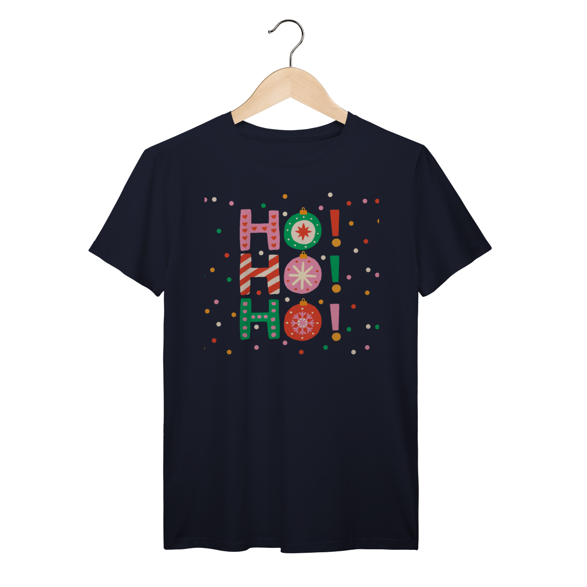 Com a estampa “Ho Ho Ho!” estilizada em letras super coloridas — com detalhes em candy cane, bolas e estrelas — e rodeada por confetes festivos, ela traz aquele mood de festa que combina com dezembro inteiro.