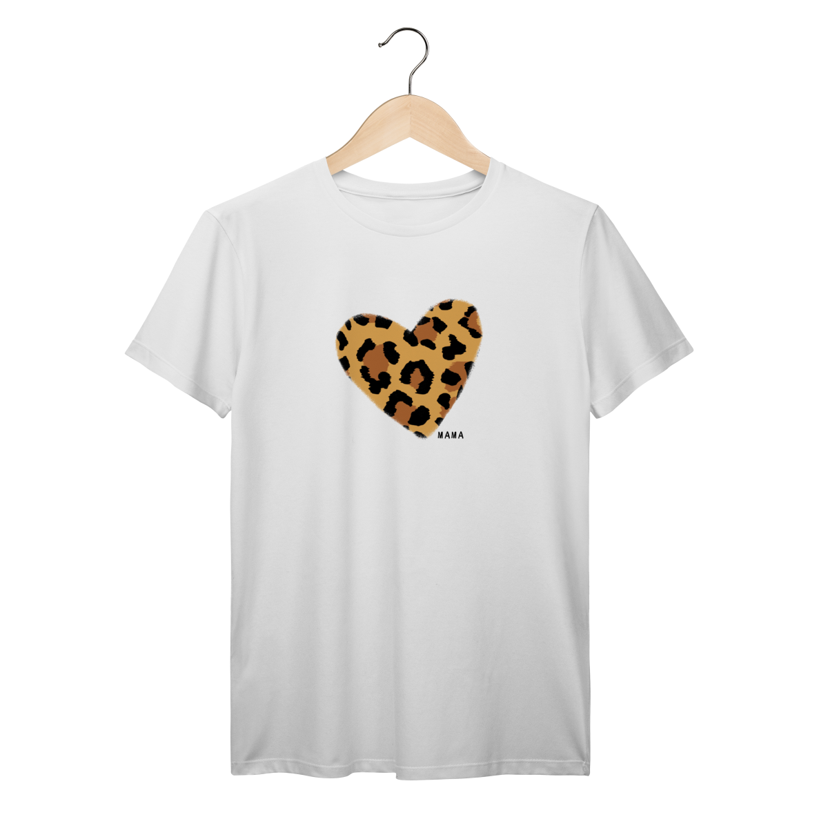 A camiseta traz um coração em animal print super moderno e o detalhe “MAMA” — acompanhada da versão infantil “MINI”, criando o look perfeito para mães e filhas que amam combinar.