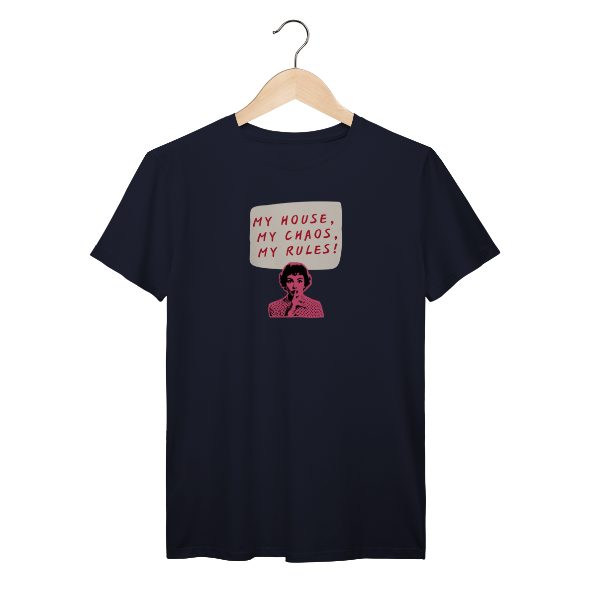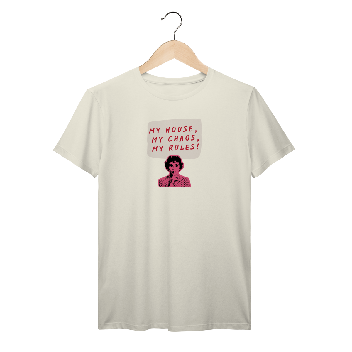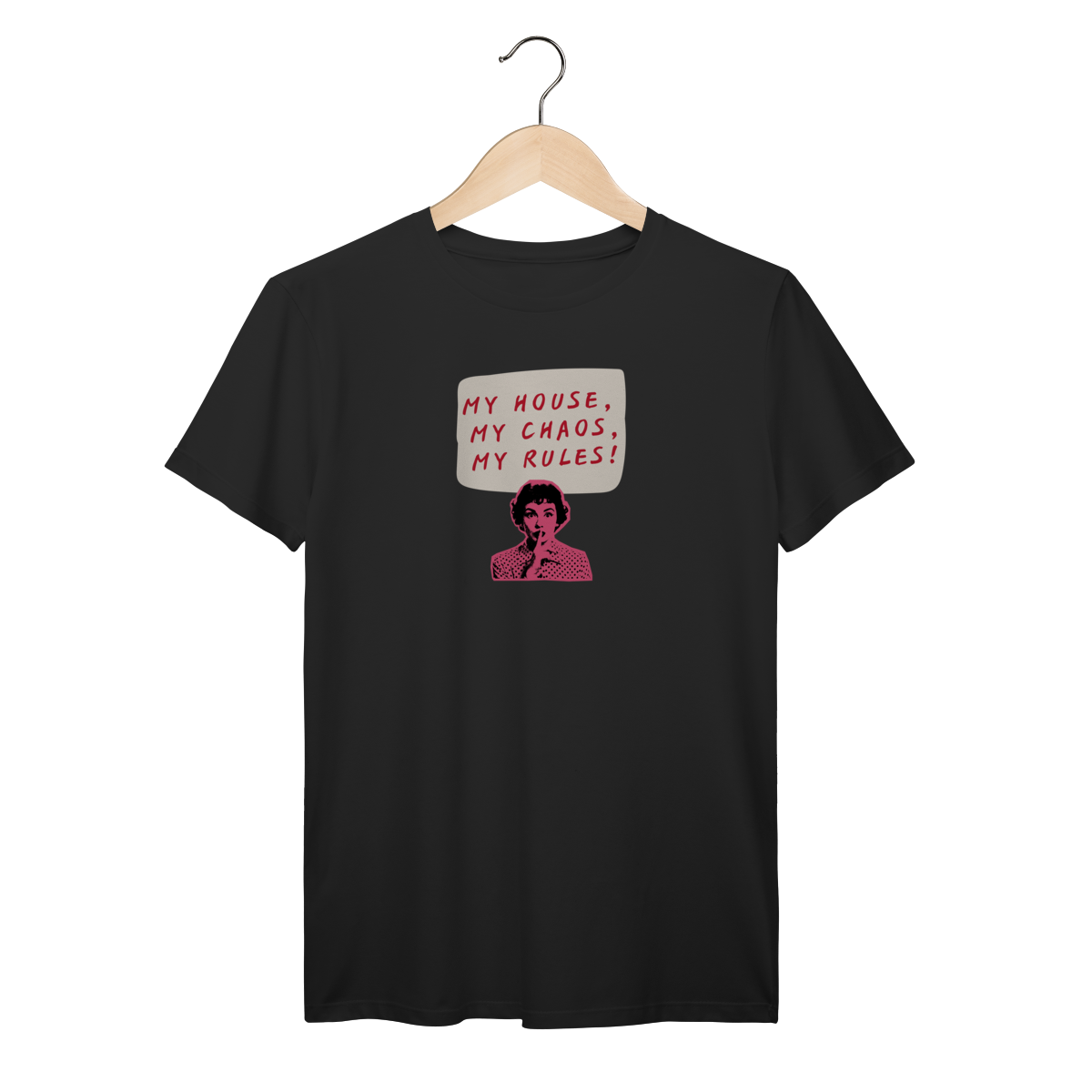 Com design em estilo retrô pop-art e uma personagem vintage em rosa vibrante, a peça traz o balão de fala: “My house, my chaos, my rules!” — uma frase divertida, sincera e cheia de atitude.