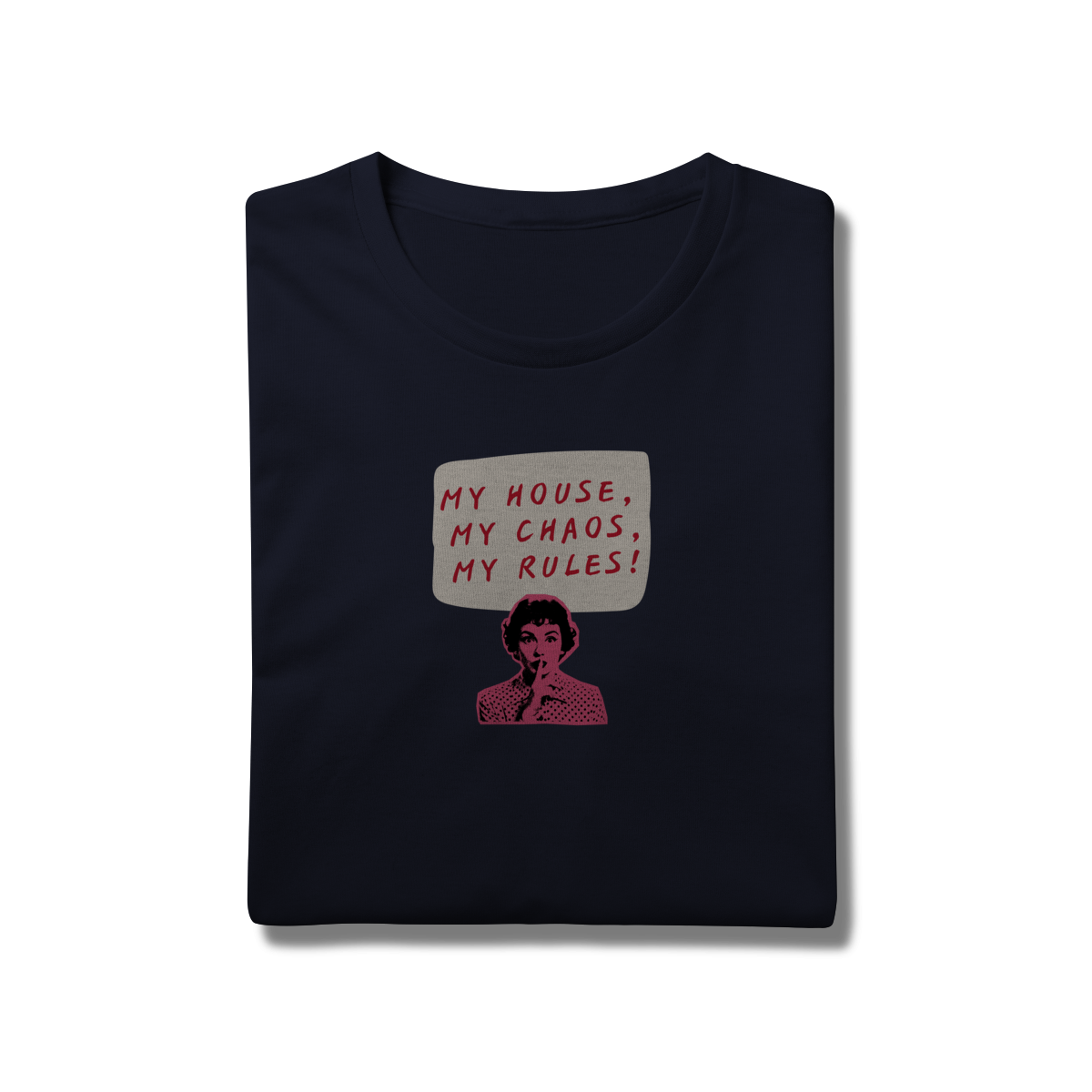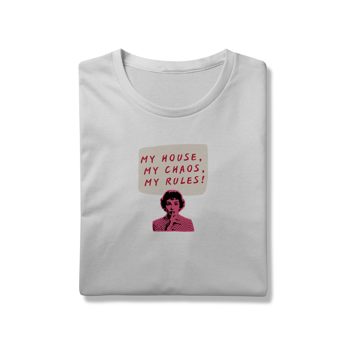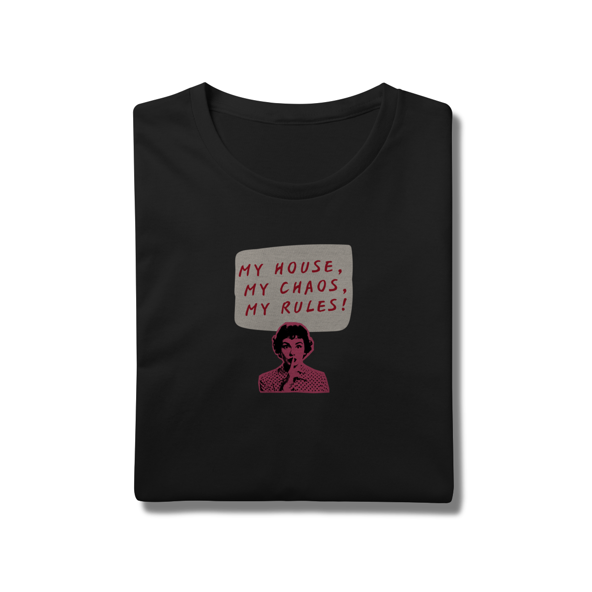 Com design em estilo retrô pop-art e uma personagem vintage em rosa vibrante, a peça traz o balão de fala: “My house, my chaos, my rules!” — uma frase divertida, sincera e cheia de atitude.