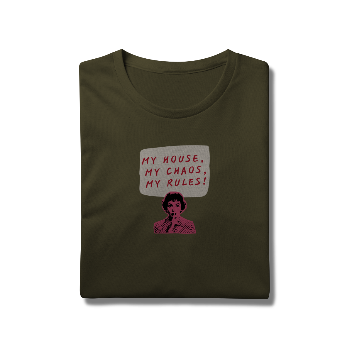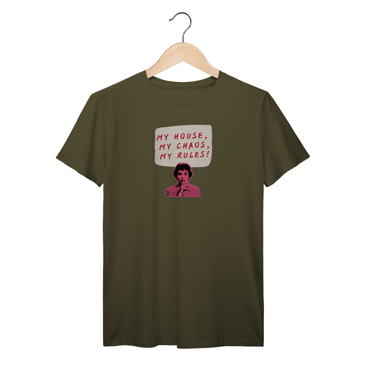 Camiseta “My House, My Chaos, My Rules!” — humor, personalidade e zero paciência pra opiniões alheias