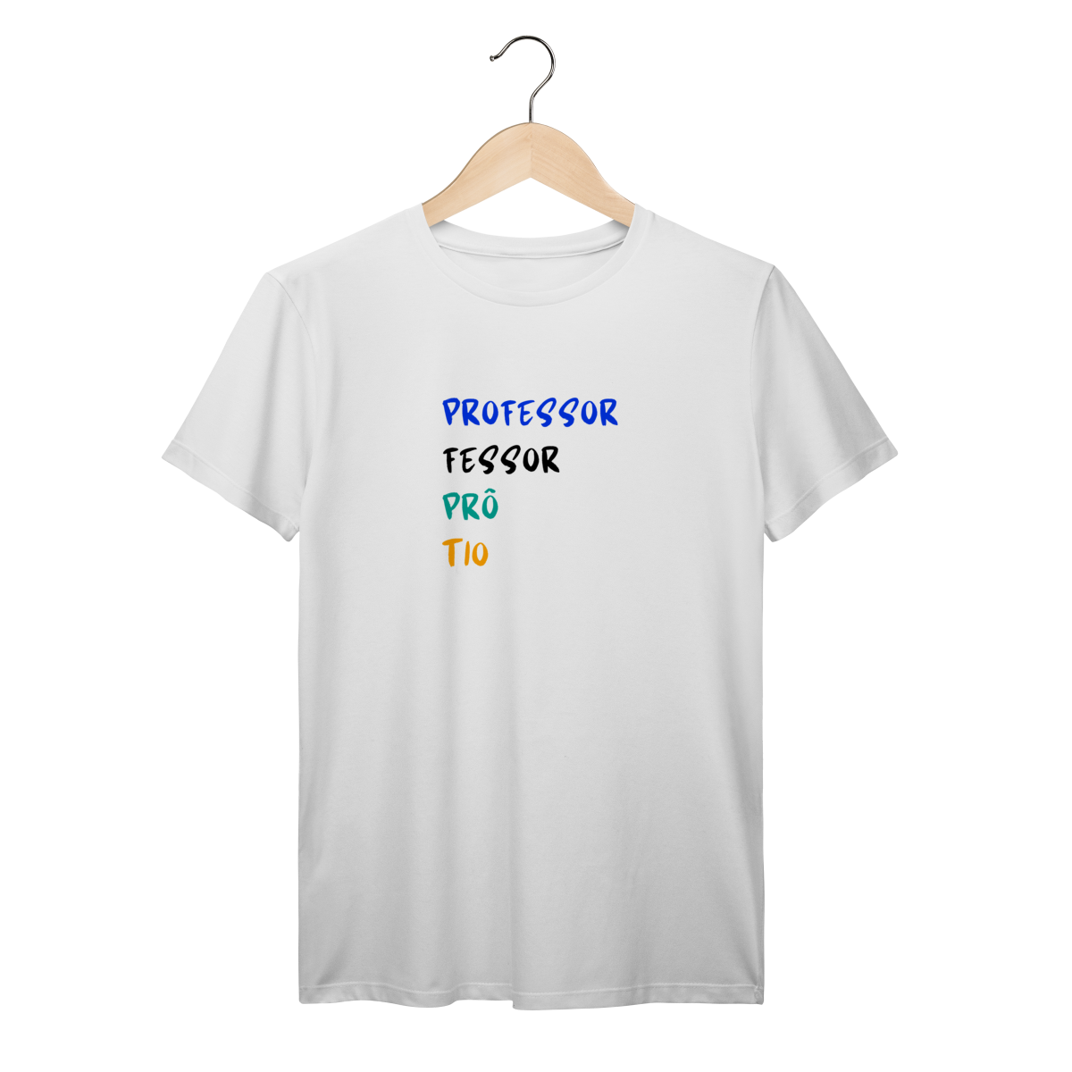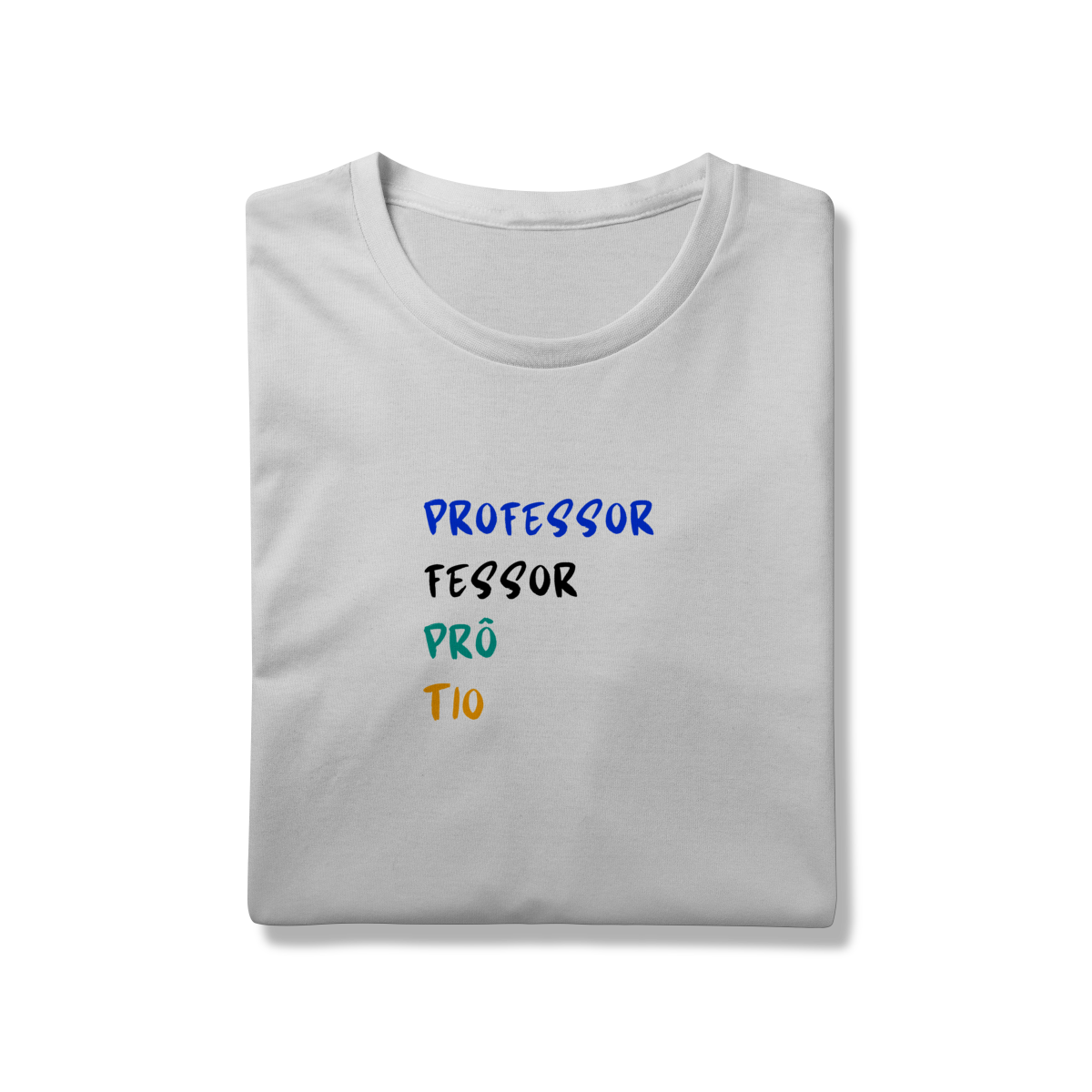 Camiseta divertida branca com estampa minimalista em tipografia colorida que destaca diferentes formas carinhosas de chamar um professor: Professor, Fessor, Prô e Tio. Uma peça criativa, leve e descontraída, perfeita para presentear educadores ou usar no dia a dia escolar com estilo e humor. Ideal para professores que amam a profissão e gostam de vestir afeto.