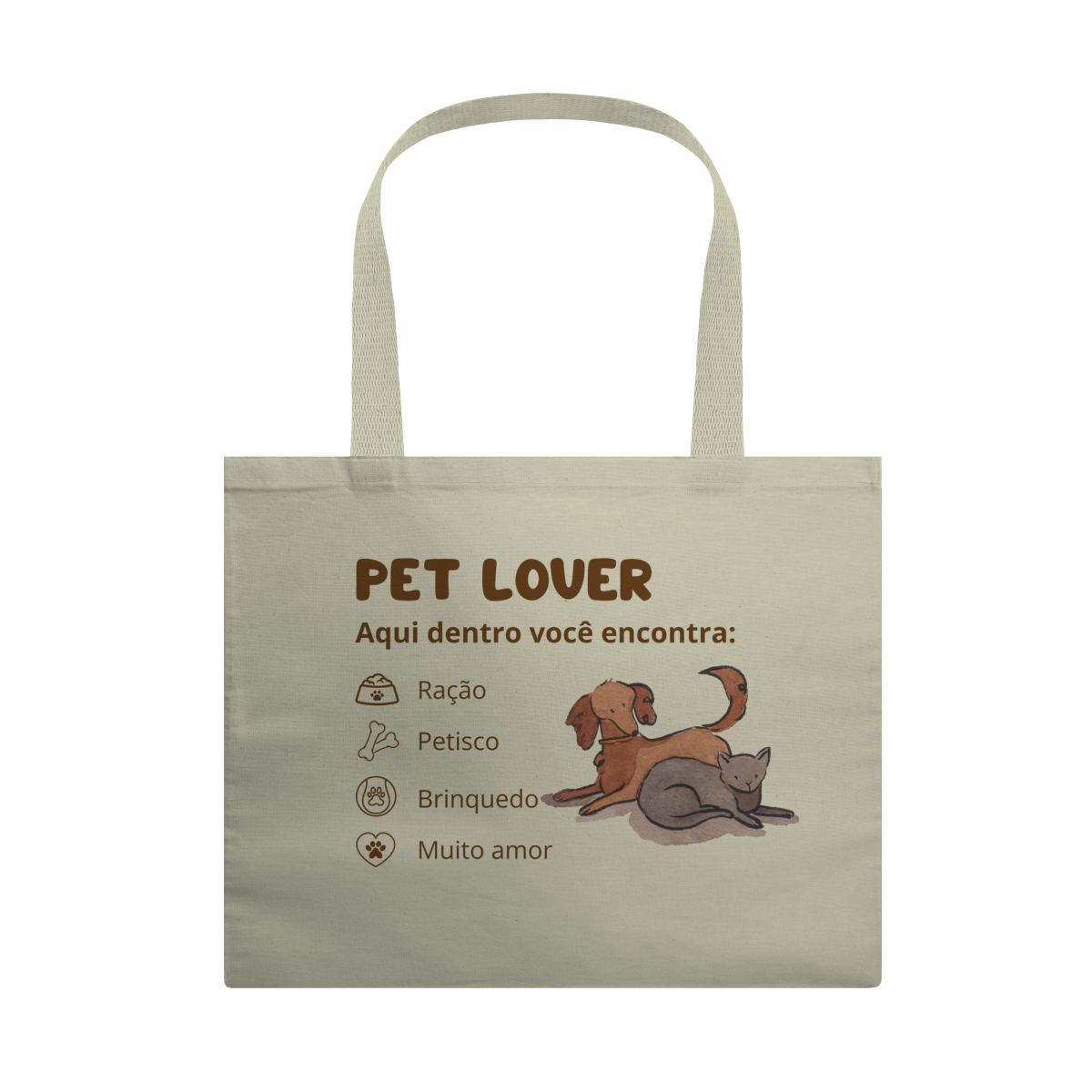 Com ilustrações fofas de um cachorro e um gato, mais a frase “Aqui dentro você encontra: ração, petisco, brinquedo e muito amor”, ela representa exatamente a vida de quem é pet lover de verdade.